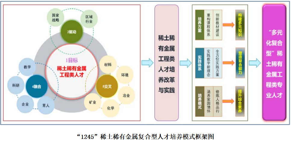冶金工程学院以“国家战略需求、服务区域行业特色”为驱动,“教学、科研、企业、育人”有机相融合,“矿业-冶金-材料-化学-环境”多元学科交互渗透为基础,形成“一目标、二驱动、四融合、五交叉”的“1245”稀土稀有金属复合型人才培养模式,解决稀有金属行业发展领域拓宽后相关知识体系的融合、新工科背景下实践与创新能力的提高、人格品行与职业素养全面提升等问题,为稀土稀有金属行业的发展提供人才保障和技术支持。