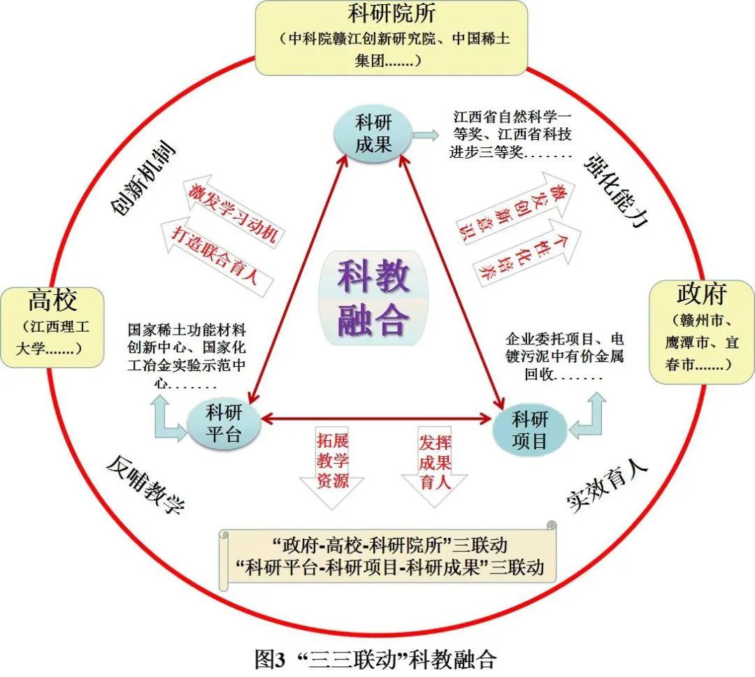 依托政府、高校、科研院所三主体,通过科研平台、科研项目、科研成果三载体,从“科研平台为载体强化创新能力培养”“科研项目为载体打造联合育人机制”“科研成果为载体夯实理论教学成效”三方面,创建“三三联动”科教融合新举措,加强在人员互聘、设施共享、联合育人、合作攻关等方面的深度合作,形成产业需求主导、政府资源配制、高校基础支撑、科研院所联动的创新型人才培养。
