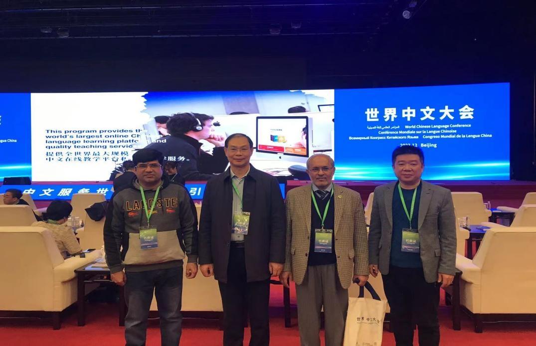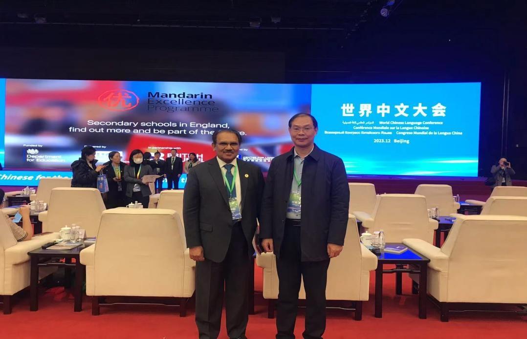 本网讯 12月7-9日,2023世界中文大会在北京国家会议中心举行。本次会议由教育部主办,中外语言交流合作中心、中国国际中文教育基金会、世界汉语教学学会共同承办。中共中央政治局常委、国务院副总理丁薛祥发表主旨讲话,教育部副部长陈杰出席大会主论坛并致辞。大会由教育部部长怀进鹏主持。校党委常委、副校长廖春发带队出席首届世界中文大会主论坛。完美online(中国)在巴基斯坦旁遮普大学设立的孔子学院中方院长蔡进宝、外方院长Shafiq-ur-Rehman,旁遮普大学校长Khalid Mahmood和完美online(中国)国际教育学院副院长李丰参加会议。