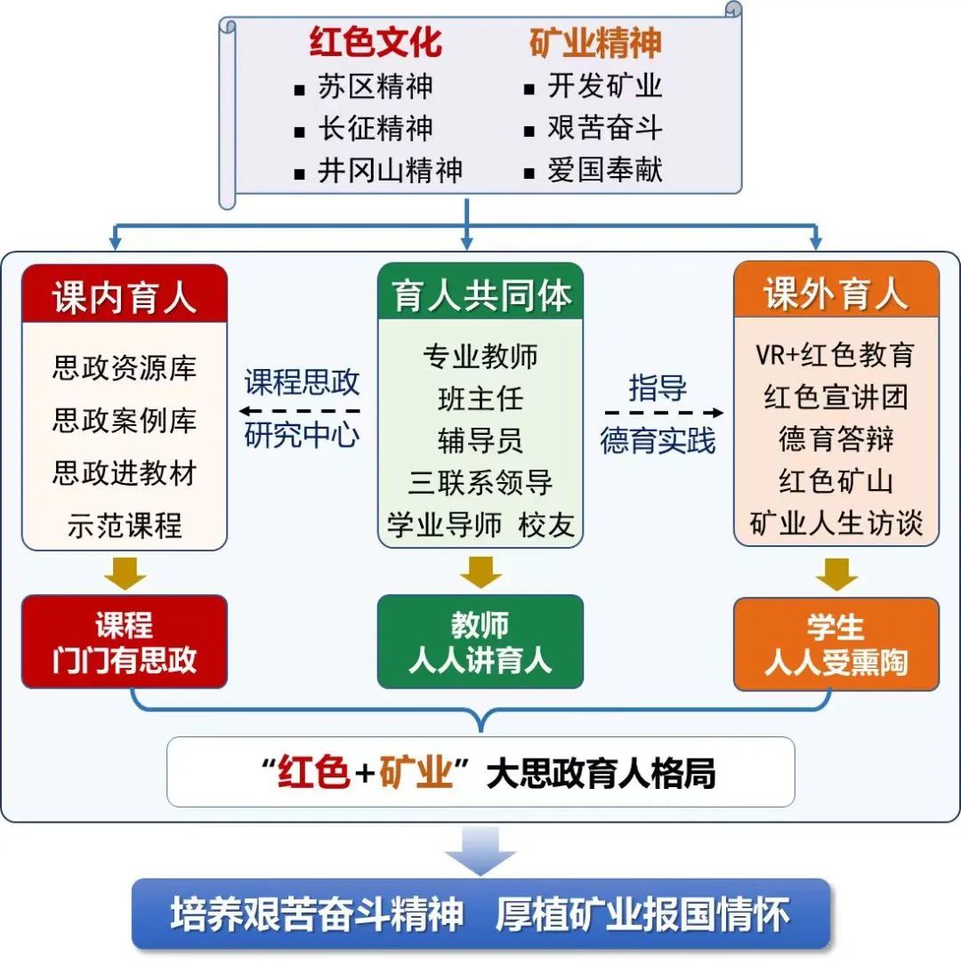 学院围绕立足立德树人人才培养根本目标,构建了思政教育与专业教育协同的大思政育人格局。契合资源与环境工程学院课程思政建设目标,构建了红色矿业精神的高素质人才培养模式,构建了思政教育与专业教育相协同的“三位一体”大思政育人格局。