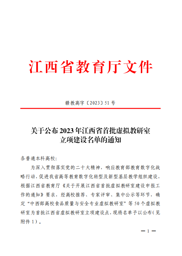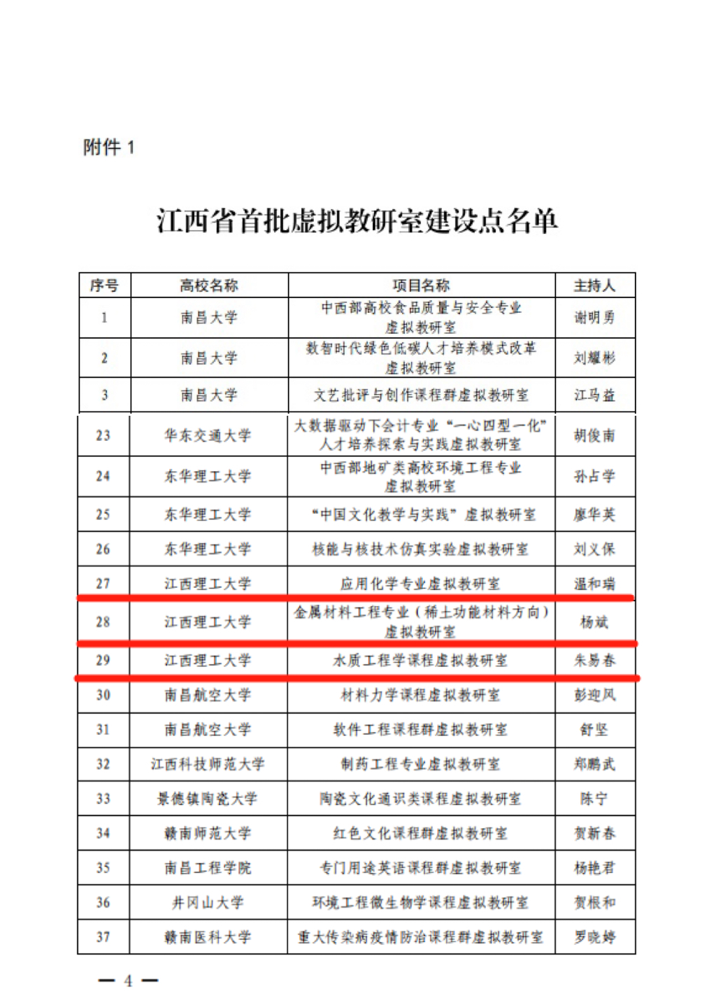 本网讯  近日,江西省教育厅下发了《关于公布2023年江西省首批虚拟教研室立项建设名单的通知》(赣教高字〔2023〕51 号),完美online(中国)申报的应用化学专业虚拟教研室、金属材料工程专业(稀土功能材料方向)虚拟教研室、水质工程学课程虚拟教研室获批确立为首批江西省虚拟教研室立项建设点。