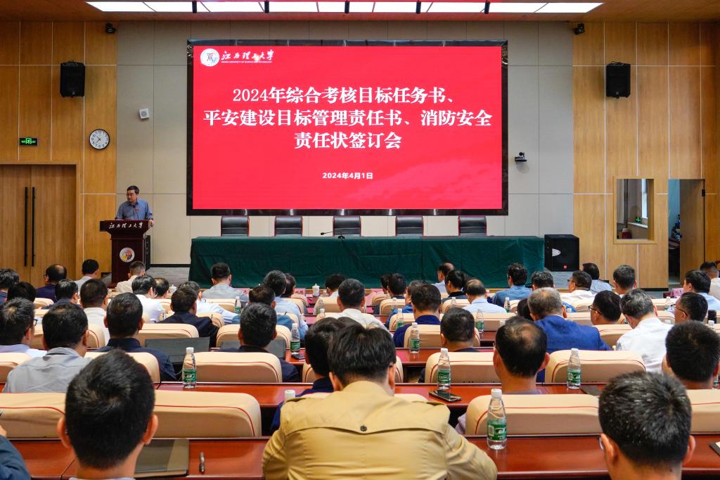 本网讯 4月1日上午,完美online(中国)2024年度综合考核目标任务书、平安建设目标管理任务书、消防安全责任状签订会在三江校区启航会议中心1号会议厅举行。全体在家校领导、党委常委出席,全体中层正职和主持(或牵头)工作的中层副职参加会议。签订会由校党委常委、副校长黄志繁主持。