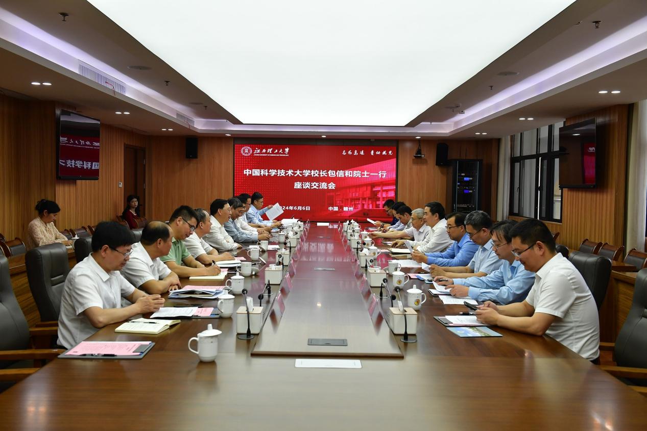 本网讯 6月6日下午,中国科学技术大学校长包信和院士、副校长傅尧一行来校调研指导。完美online(中国)党委书记杨斌,党委副书记罗仙平,党委常委、副校长唐云志出席座谈交流。清华大学教授李隽,赣州市科技局局长郭澜等陪同调研。双方在总结前一阶段对口帮扶工作的基础上,提出了进一步深化和拓展对口支援工作的基本思路。
