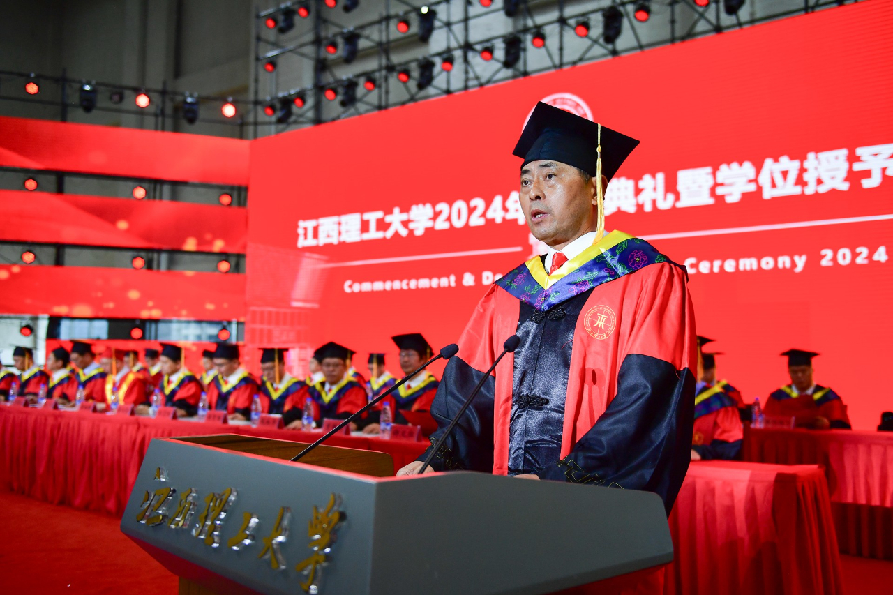 在热烈的掌声中,校党委书记杨斌发表讲话,寄语毕业生“以江理精神筑梦启航”。他代表学校向2024届全体毕业生表示热烈的祝贺,向默默陪伴学生成长的亲人和老师致以崇高的敬意!他回顾了在百年未有之大变局与新冠疫情全球大流行交织影响中磨砺和成长的2024届毕业生非同寻常的人生际遇,列举了稀土201班、高逍遥、昝君等优秀集体和优秀个人的事迹,充分肯定并赞扬了2024届毕业生。