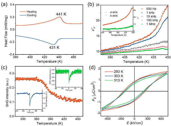 由于层状材料容易成膜,层状铁电材料是制备铁电薄膜器件的首选。尽管最近几年有一些层状铁电配合物报道,但是这些材料大多都只显示面内极化,不利于器件应用。缪乐平等基于“铁电化学”,利用稀土离子丰富的配位模式,引入手性,构建了钙钛矿型层状手性稀土配合物,在有机组分上进行F取代,通过F取代效应成功调节实现了面外极化的铁电性。该材料不仅表现出多极轴面外铁电性和铁电-铁弹性,还具有圆偏振发光(CPL),在下一代微-纳光电器件领域显示了应用潜力(图2)。该成果不但为稀土铁电材料在新光电器件中的应用提供更多可能,也为稀土功能配合物的研究提供了新思路。