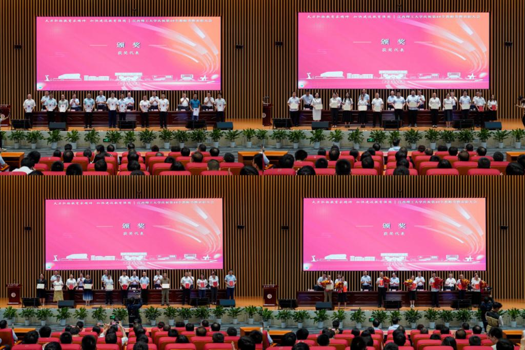 获奖教师先后上台接受表彰,校领导及与会师生向获得表彰的优秀集体与个人送上了热烈的掌声。奖项包括获得教学成果类奖励,科技成果类奖励,社科成果类奖励,上级表彰的先进个人,学校2023-2024年度优秀教师、优秀系(教研室、实验室)主任,学校2023-2024年度青年科技标兵、管理育人标兵,学校2023-2024年度服务育人标兵、师德师风先进个人,学校2023-2024年度优秀辅导员、就业管理与服务先进个人、优秀班主任,长期从教三十年荣誉教师。