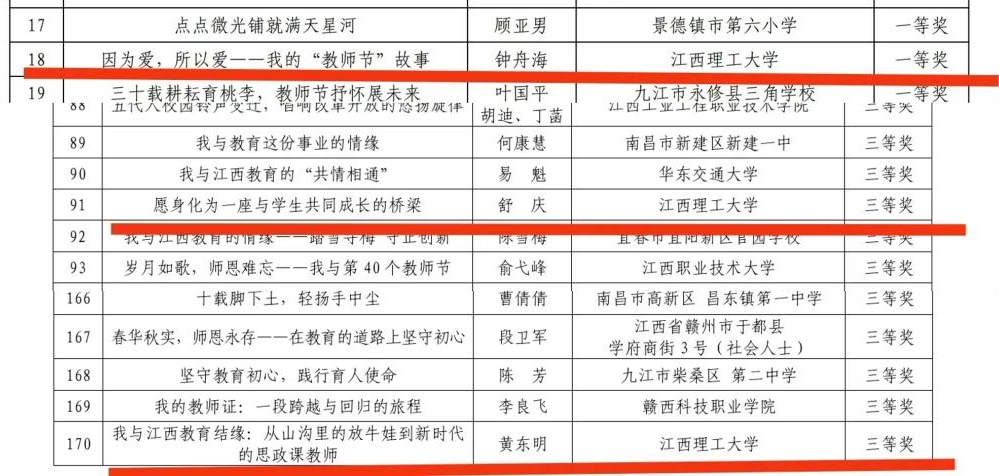 据悉,此次活动由江西省教育厅、中国教师报、中共江西省委当代江西杂志社联合开展,旨在深入学习贯彻习近平总书记关于教育的重要论述和考察江西重要讲话精神,大力营造全社会尊师重教良好氛围,激发广大教育工作者和关心爱护教育事业的社会各界人士的创作热情。经个人申报、单位推荐、文章查重、专家组评审,共评选出“我与第40个教师节”主题征文作品一等奖30项、二等奖50项、三等奖90项。