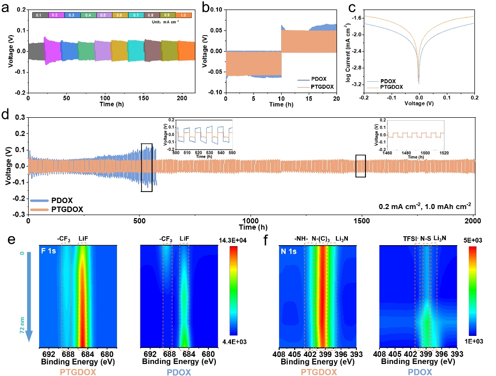 该研究工作创新性地制备出了具有高浓度游离Li+和合理Li+配位的固态电解质,大幅提升了Li+迁移数;同时,均匀稳定网络交联结构使固态聚合物电解质展现出具有良好热稳定性和高的机械强度。在电池的充放电过程中,固态电解质中的异氰脲酸基团在金属Li电极上形成了LiF/N-(C)3/Li3N富集的稳定固态电解质界面层,抑制了锂枝晶的生长,对称电池在1.0 mAh cm-2下可逆的锂沉积/剥离超过2000小时;与LFP和NCM811正极配对时,在高倍率和高温下也可以实现稳定的循环。该电解质的应用大幅提升了固态电池的倍率性能、使用寿命和热稳定性。该工作为固态电解质的开发提供了新思路。