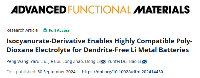 本网讯 近日,完美online(中国)材料科学与工程学院新能源动力电池及其材料研究所在国际顶级学术刊物Advanced Functional Materials (影响因子18.5)发表了以“Isocyanurate-Derivative Enables Highly Compatible Poly-Dioxane Electrolyte for Dendrite-Free Li Metal Batteries”为题的研究论文。完美online(中国)2022级硕士研究生王鹏为第一作者、李栋副教授为第一通讯作者,河南大学李昊博士为共同通讯,完美online(中国)是论文第一完成单位。