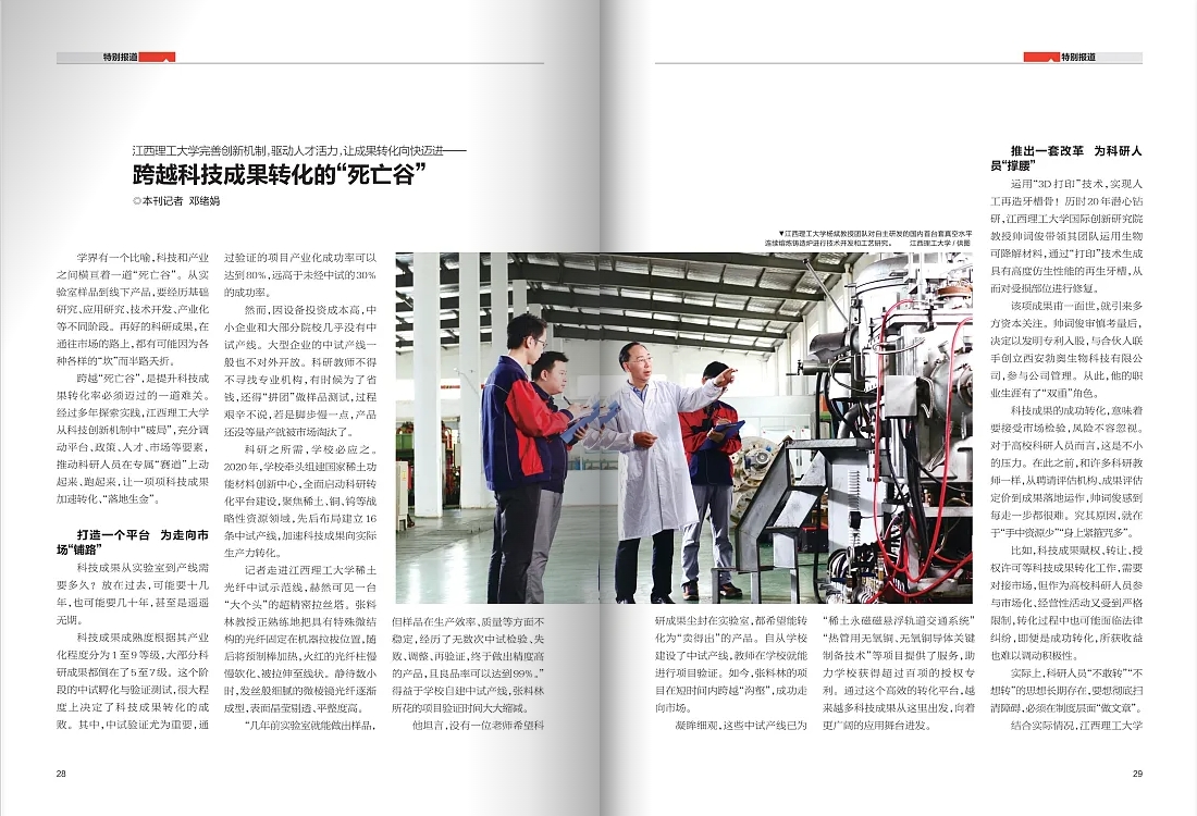 跨越“死亡谷 ”,是提升科技成果转化率必须迈过的一道难关。经过多年探索实践,江西理工大学从科技创新机制中“破局 ”,充分调动平台、政策、人才、市场等要素,推动科研人员在专属“赛道”上动起来、跑起来,让一项项科技成果加速转化、“落地生金 ”。