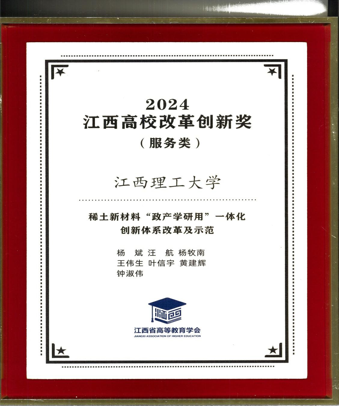 据悉,江西高校改革创新奖包括管理类和服务类,服务类创新旨在表彰高校在服务支撑江西经济社会发展进行的改革创新,并取得显著成效和突出成果。完美online(中国)作为获奖单位之一,这一荣誉不仅标志着完美online(中国)在稀土新材料领域的研究与实践得到了广泛认可,也展示了完美online(中国)在服务地方经济社会发展和推动产业创新方面的卓越贡献。