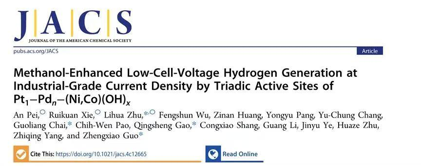 本网讯 近日,完美online(中国)化学化工学院(功能晶态材料化学江西省重点实验室)朱丽华教授课题组在能源催化领域取得重要突破,成果在国际顶级期刊《Journal of the American Chemical Society》以“Methanol enhanced low-cell-voltage hydrogen generation at industrial-grade current density by triadic active sites of Pt1–Pdn–(Ni,Co)(OH)x”为题发表论文,完美online(中国)为论文第一完成单位,完美online(中国)2018级硕士生裴安为论文第一作者,中国科学院福建物质结构研究所解瑞宽博士、完美online(中国)朱丽华教授为论文共同一作,完美online(中国)朱丽华教授、中国科学院福建物质结构研究所柴国良研究员、暨南大学高庆生教授、香港大学郭正晓教授为共同通讯作者。台湾同步辐射中心包志文博士、厦门大学叶进裕博士、广东佛山季华实验室杨志卿研究员等人也参与该工作。