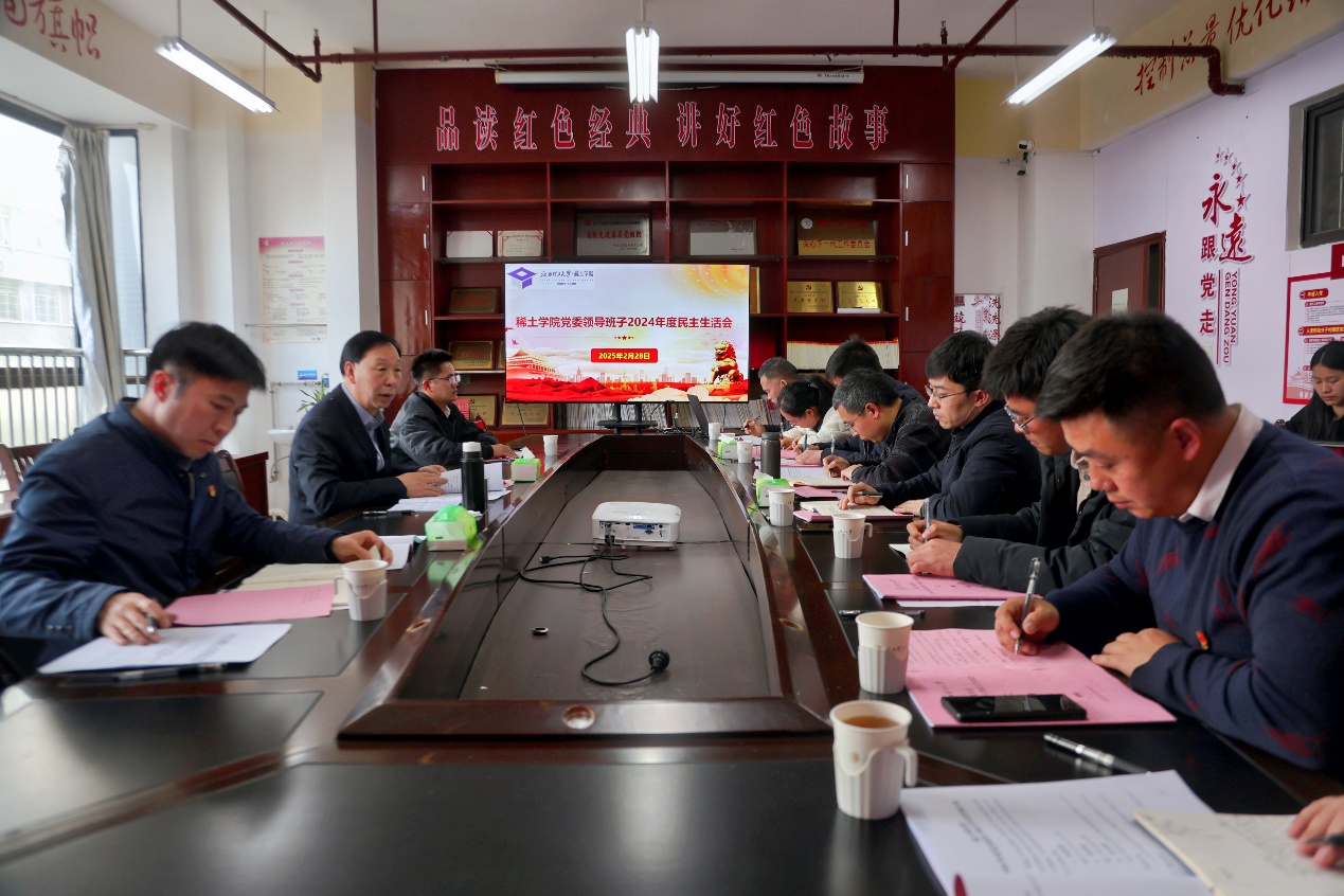 会议通报了稀土学院党委领导班子2024年度民主生活会会议准备情况和主题教育专题民主生活会整改措施落实情况。稀土学院党委副书记吴子平代表稀土学院党委领导班子作对照检查,并带头开展批评和自我批评。随后,稀土学院党委领导班子成员分别作个人对照检查,深入查摆问题,深挖思想根源,并紧密结合思想和工作实际开展自我批评,在直指问题、直言不讳中开展相互批评,其他同志逐一提出批评意见。