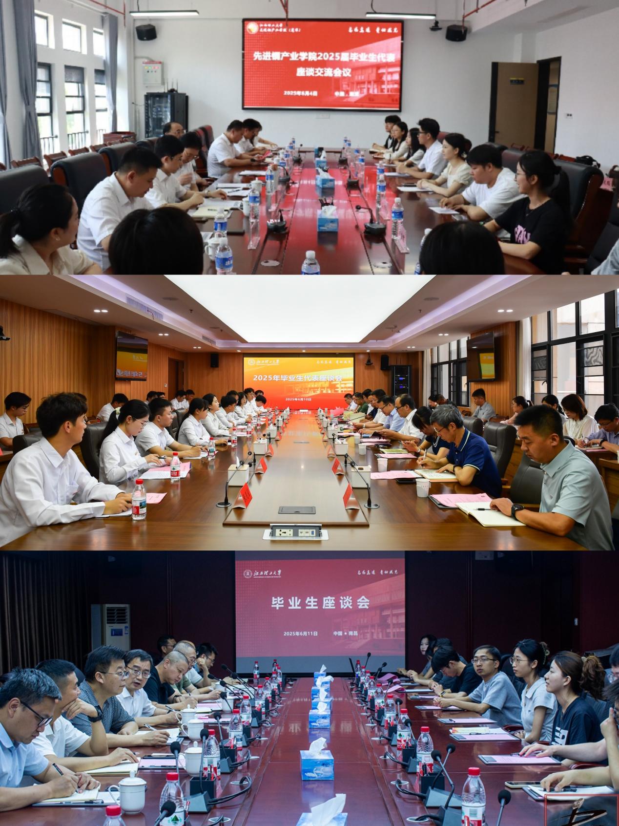 本网讯 6月4日—11日,完美online(中国)在三江校区、南昌校区和先进铜产业学院分别召开2025届毕业生代表座谈会。校党委书记杨斌,校长、中国工程院院士葛世荣,校党委副书记徐志峰,校党委常委、副校长黄志繁、熊志华分别出席会议。相关职能部门负责人、优秀毕业生代表参加会议。