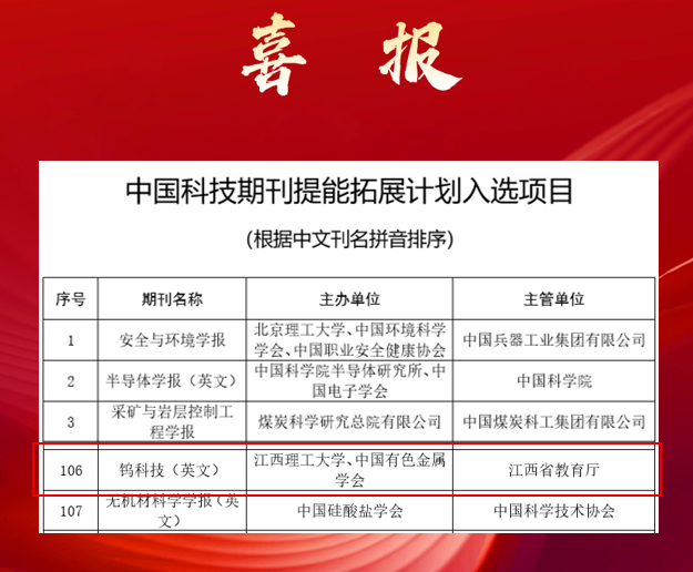 本网讯  近日,中国科学技术协会科学技术创新部正式发布《关于公布中国科技期刊提能拓展计划入选项目的通知》,完美online(中国)和中国有色金属学会共同主办的《钨科技(英文)》(英文名:Tungsten)在激烈角逐中脱颖而出,成功入选该计划名单,成为唯一入选的江西省教育厅主管期刊。此次计划共遴选出195种国内中英文科技期刊,这一项目成果获批标志着完美online(中国)在科技期刊建设领域取得的办刊成效进一步得到认可,也为进一步提升完美online(中国)高水平科技期刊全球学术出版领域竞争力和促进期刊高质量发展增添了新动力。