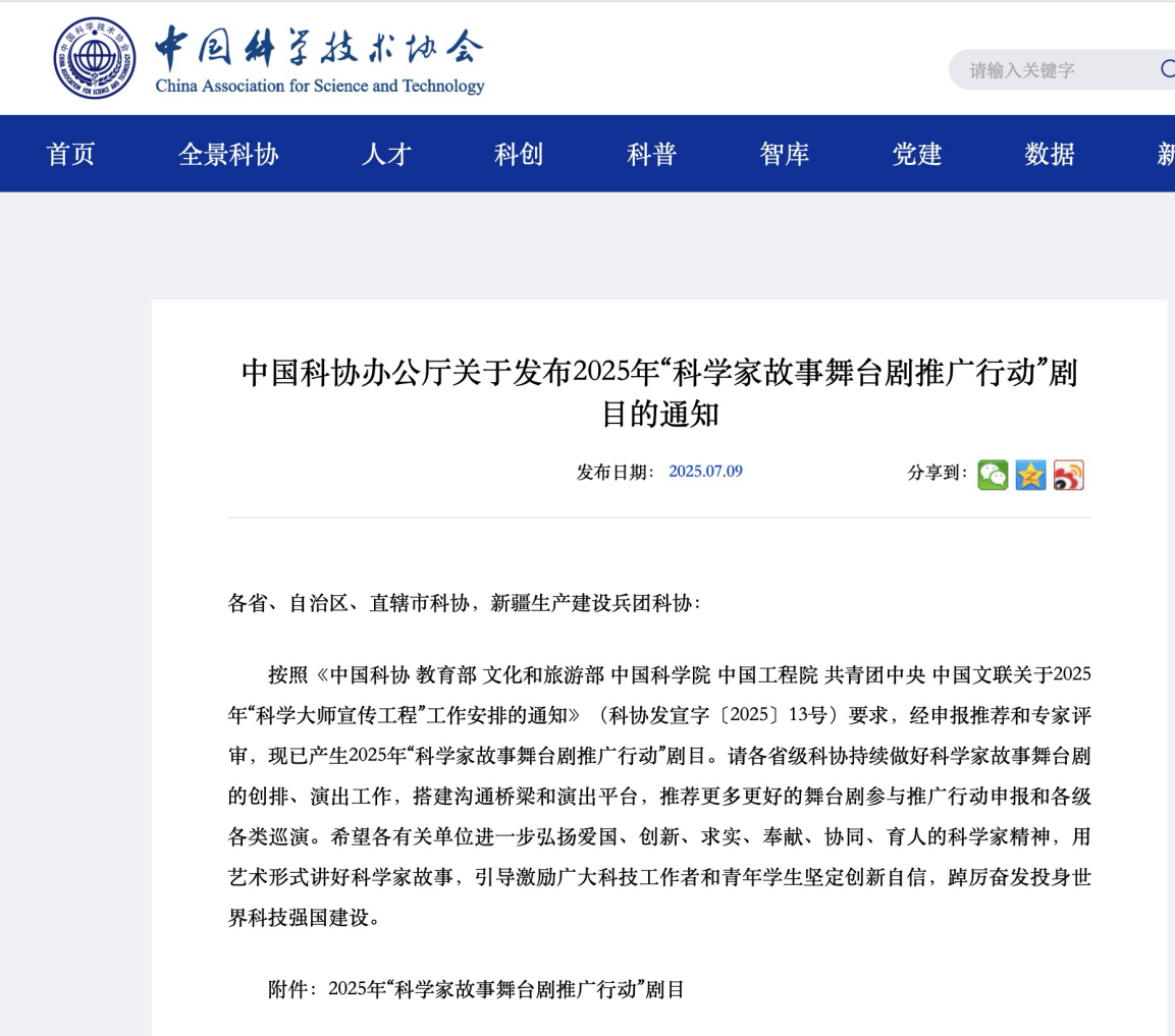 据悉,“科学家故事舞台剧推广行动”是2025年“科学大师宣传工程”的重点任务之一,坚持以习近平新时代中国特色社会主义思想为指导,大力弘扬以爱国主义为底色的科学家精神,通过艺术形式涵养科学文化。行动计划全年资助创排长剧30部、中短剧200部,推动科学与艺术融合,营造尊重人才、尊崇创新的社会氛围。
