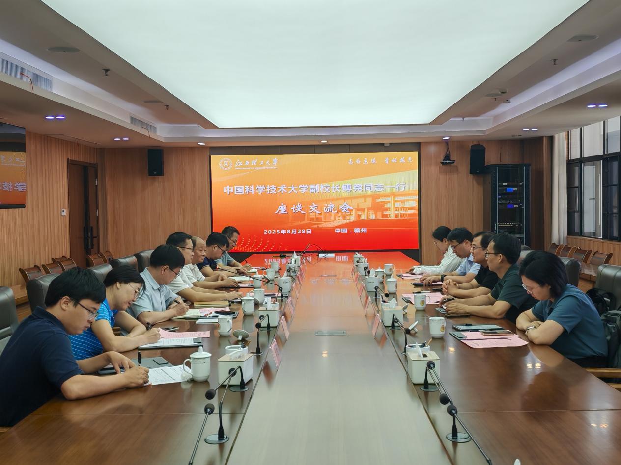 本网讯 8月28日上午,中国科学技术大学党委常委、副校长傅尧同志一行到校调研交流,洽谈对口帮扶和深化双方科研合作。江西理工大学党委常委、副校长熊志华、中国科学技术大学化学与材料科学学院党委书记兼副院长徐允河、环境科学与工程系(直属)执行主任穆杨、重大任务处处长刘静等出席座谈交流会。会议由校科学技术处处长吴彩斌主持。