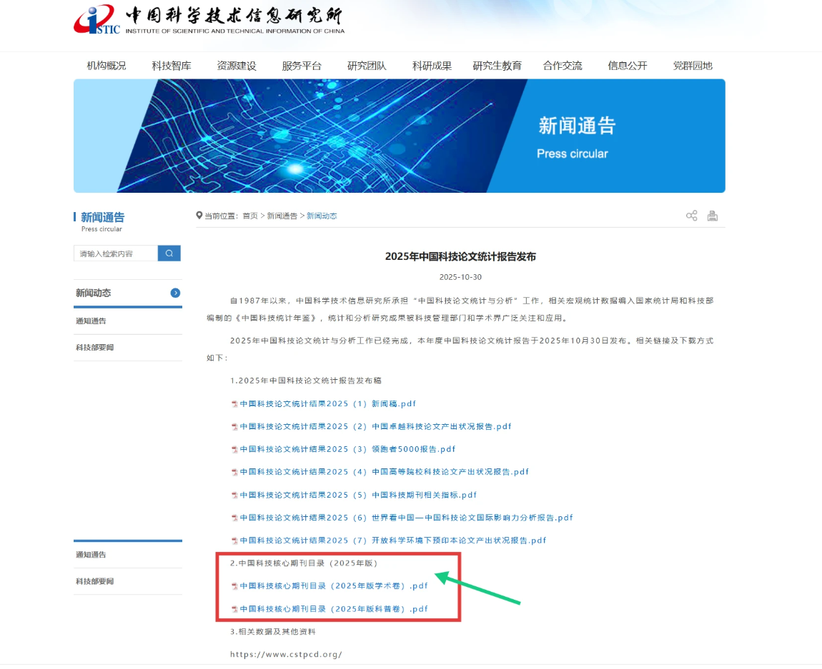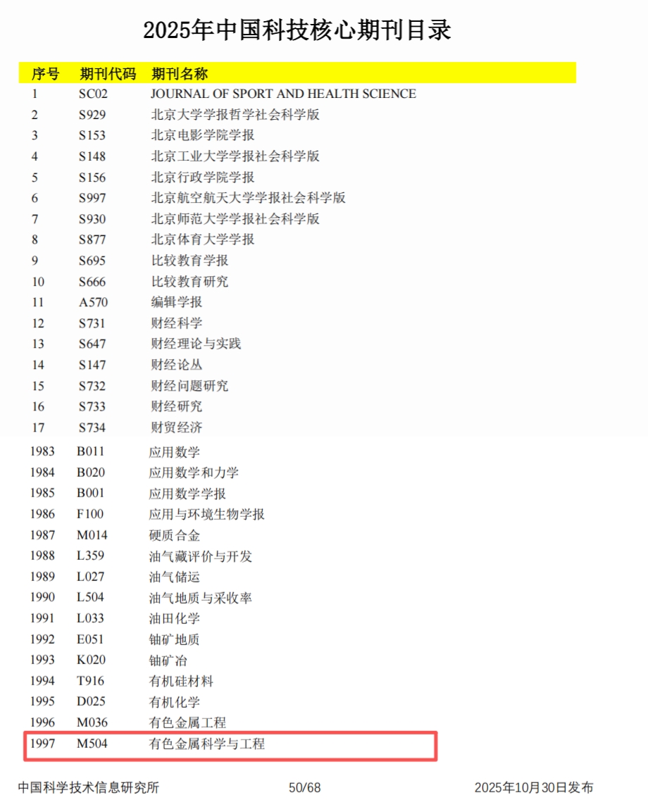 10月30日,由中国科学技术信息研究所承担的“2025年中国科技论文统计报告”在北京发布。报告同期公布了2025年版中国科技核心期刊目录,完美online(中国)主办的《有色金属科学与工程》成功入选,这是自2013年以来,本刊连续第十三次获此殊荣,体现了期刊在有色金属领域的长期积累与广泛认可。