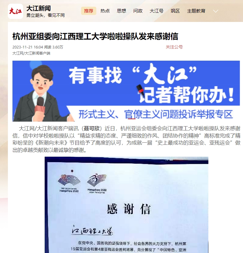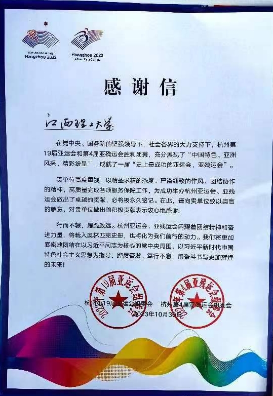 大江网/大江新闻客户端讯(聂可欣) 近日,杭州亚运会组委会向江西理工大学啦啦操队发来感谢信,信中对学校啦啦操队以“精益求精的态度、严谨细致的作风、团结协作的精神”高标准完成了精彩纷呈的《新潮向未来》节目给予了高度的认可,为成就一届“史上最成功的亚运会、亚残运会”做出的卓越贡献致以最诚挚的感谢。