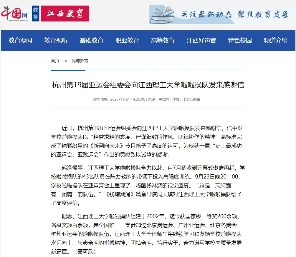 《江西教育》:杭州第19届亚运会组委会向江西理工大学啦啦操队发来感谢信