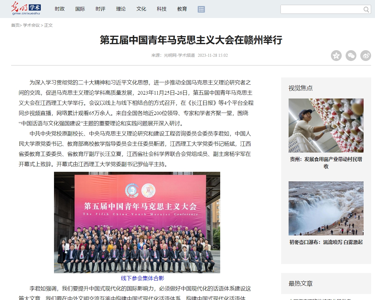 为深入学习贯彻党的二十大精神和习近平文化思想,进一步推动全国马克思主义理论研究者之间的交流,促进马克思主义理论学科高质量发展,2023年11月25日-26日,第五届中国青年马克思主义大会在江西理工大学举行。会议以线上与线下相结合的方式召开,在《长江日报》等4个平台全程同步视频直播,网络累计观看65万余人。来自全国各地近200位领导、专家和学者齐聚一堂,围绕“中国话语与文化强国建设”主题的重要理论和实践问题展开深入研讨。