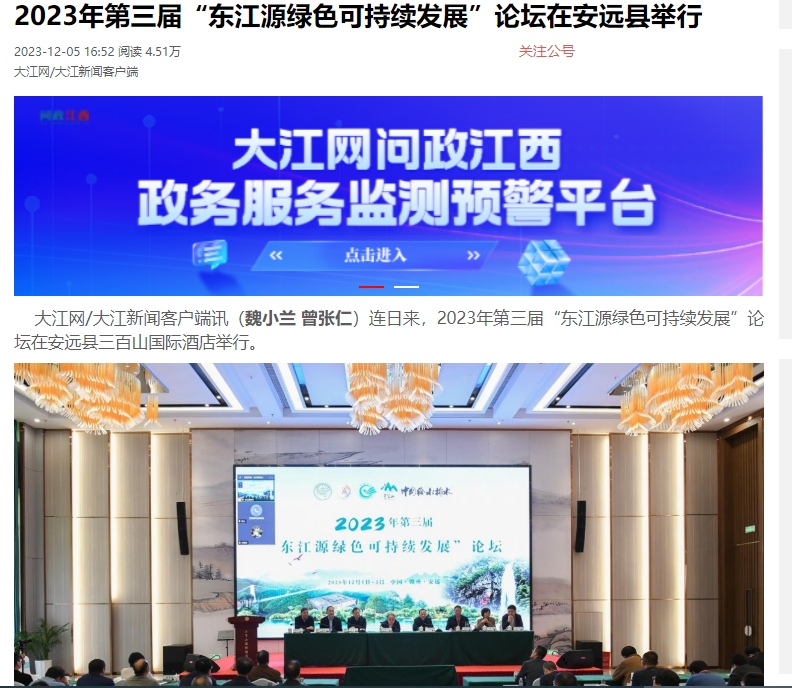 大江网/大江新闻客户端讯(魏小兰 曾张仁)连日来,2023年第三届“东江源绿色可持续发展”论坛在安远县三百山国际酒店举行。