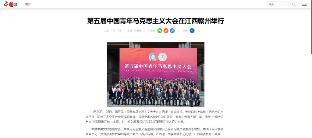 11月25日-26日,第五届中国青年马克思主义大会在江西理工大学举行。会议以线上与线下相结合的方式召开,同步在多个平台全程视频直播。来自全国各地近200位领导、专家和学者齐聚一堂,围绕“中国话语与文化强国建设”这一主题,对一系列重要理论和实践问题展开深入研讨交流。