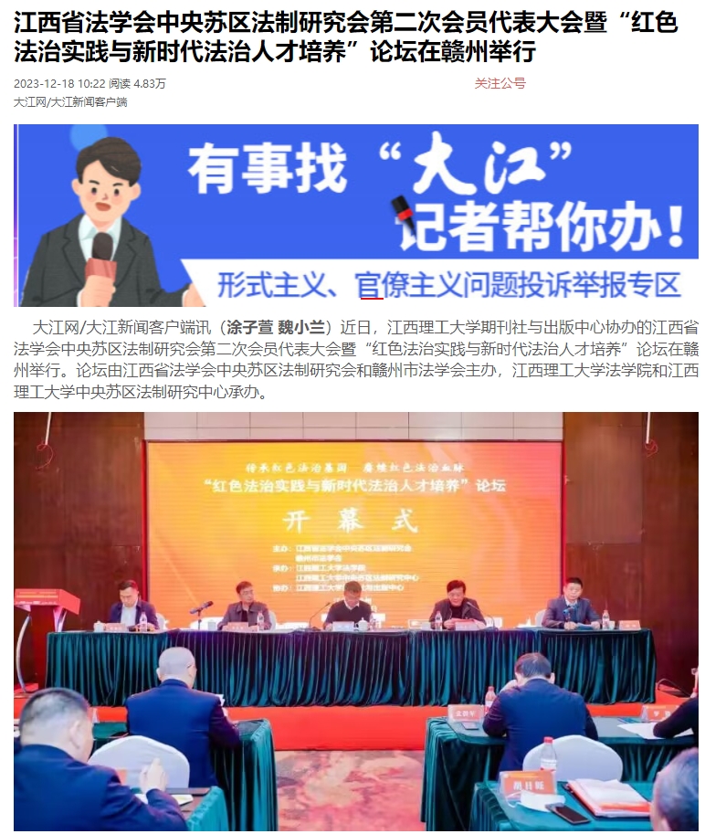 大江网/大江新闻客户端讯(涂子萱 魏小兰)近日,江西理工大学期刊社与出版中心协办的江西省法学会中央苏区法制研究会第二次会员代表大会暨“红色法治实践与新时代法治人才培养”论坛在赣州举行。论坛由江西省法学会中央苏区法制研究会和赣州市法学会主办,江西理工大学法学院和江西理工大学中央苏区法制研究中心承办。