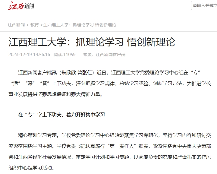 江西新闻客户端讯(朱欣欣 曾张仁)近日,江西理工大学党委理论学习中心组在“专”“活”“深”“督”上下功夫,深刻把握学习规律、总结学习经验、创新学习方法,为推进学校事业发展提供坚强思想保证和强大精神力量。