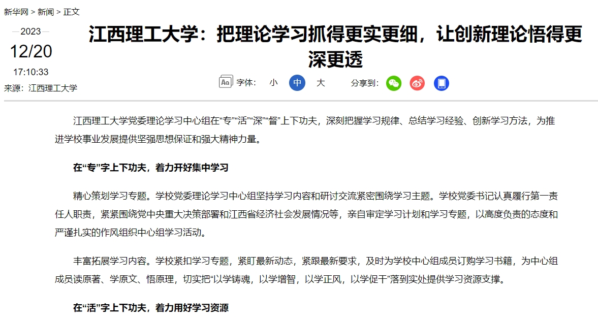 江西理工大学党委理论学习中心组在“专”“活”“深”“督”上下功夫,深刻把握学习规律、总结学习经验、创新学习方法,为推进学校事业发展提供坚强思想保证和强大精神力量。