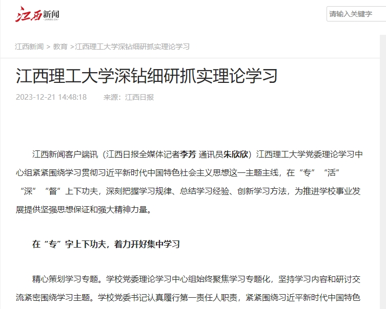 江西新闻客户端讯(江西日报全媒体记者李芳 通讯员朱欣欣)江西理工大学党委理论学习中心组紧紧围绕学习贯彻习近平新时代中国特色社会主义思想这一主题主线,在“专”“活”“深”“督”上下功夫,深刻把握学习规律、总结学习经验、创新学习方法,为推进学校事业发展提供坚强思想保证和强大精神力量。