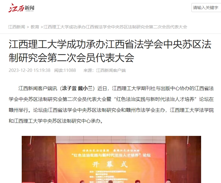 江西新闻客户端讯(涂子萱 魏小兰)近日,江西理工大学期刊社与出版中心协办的江西省法学会中央苏区法制研究会第二次会员代表大会暨“红色法治实践与新时代法治人才培养”论坛在赣州举行。论坛由江西省法学会中央苏区法制研究会和赣州市法学会主办,江西理工大学法学院和江西理工大学中央苏区法制研究中心承办。