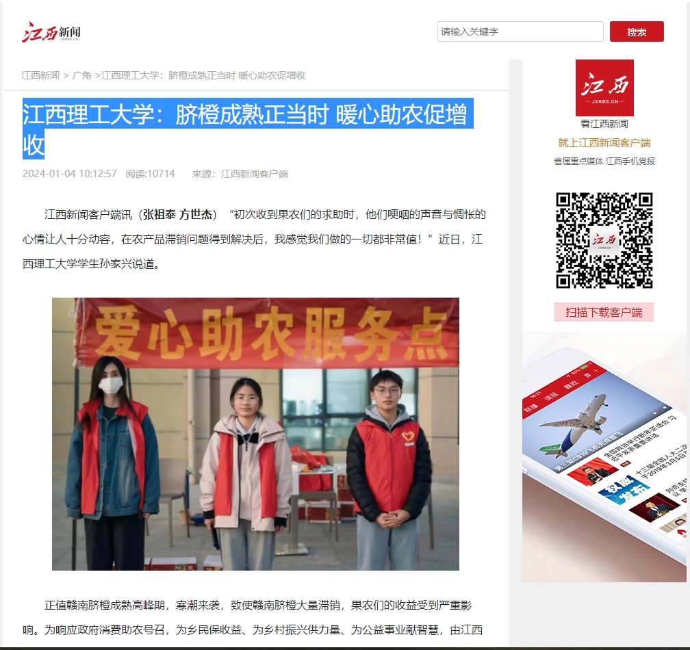 正值赣南脐橙成熟高峰期,寒潮来袭,致使赣南脐橙大量滞销,果农们的收益受到严重影响。为响应政府消费助农号召,为乡民保收益、为乡村振兴供力量、为公益事业献智慧,由江西理工大学电子商务协会、节能志愿者协会、青年志愿者协会和互联网创业协会主办的“响应赣南助农号召,贡献理工青年智慧”助农主题活动在江西理工大学三江校区多个爱心助农服务点举行。