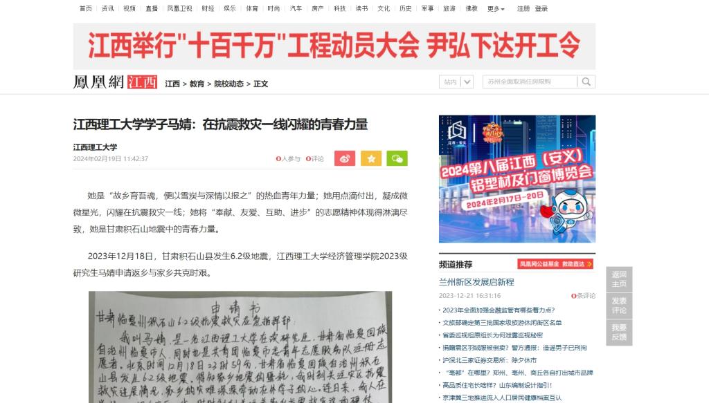 2023年12月18日,甘肃积石山县发生6.2级地震,江西理工大学经济管理学院2023级研究生马婧申请返乡与家乡共克时艰。