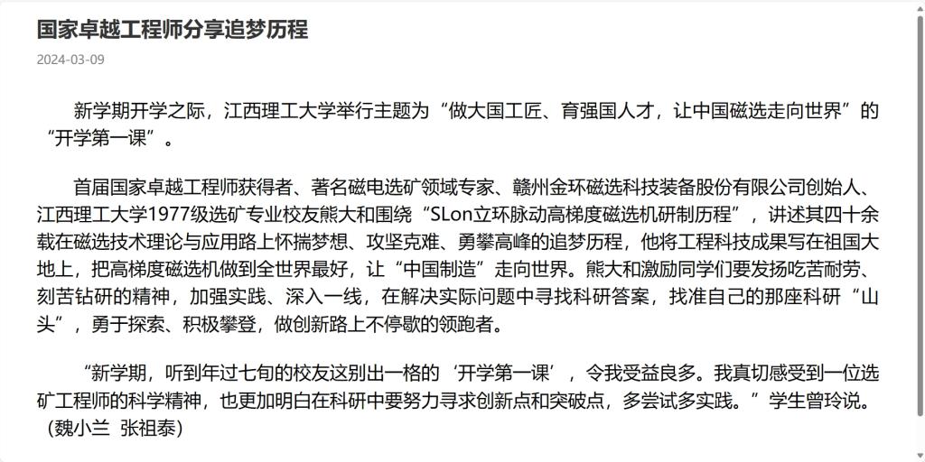 新学期开学之际,江西理工大学举行主题为“做大国工匠、育强国人才,让中国磁选走向世界”的“开学第一课”。