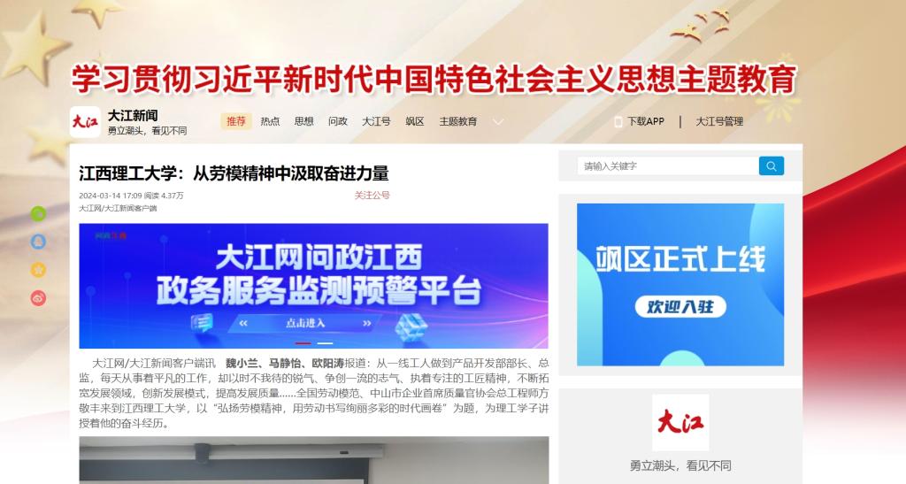 大江网/大江新闻客户端讯 魏小兰、马静怡、欧阳涛报道:从一线工人做到产品开发部部长、总监,每天从事着平凡的工作,却以时不我待的锐气、争创一流的志气、执着专注的工匠精神,不断拓宽发展领域,创新发展模式,提高发展质量……全国劳动模范、中山市企业首席质量官协会总工程师方敬丰来到江西理工大学,以“弘扬劳模精神,用劳动书写绚丽多彩的时代画卷”为题,为理工学子讲授着他的奋斗经历。