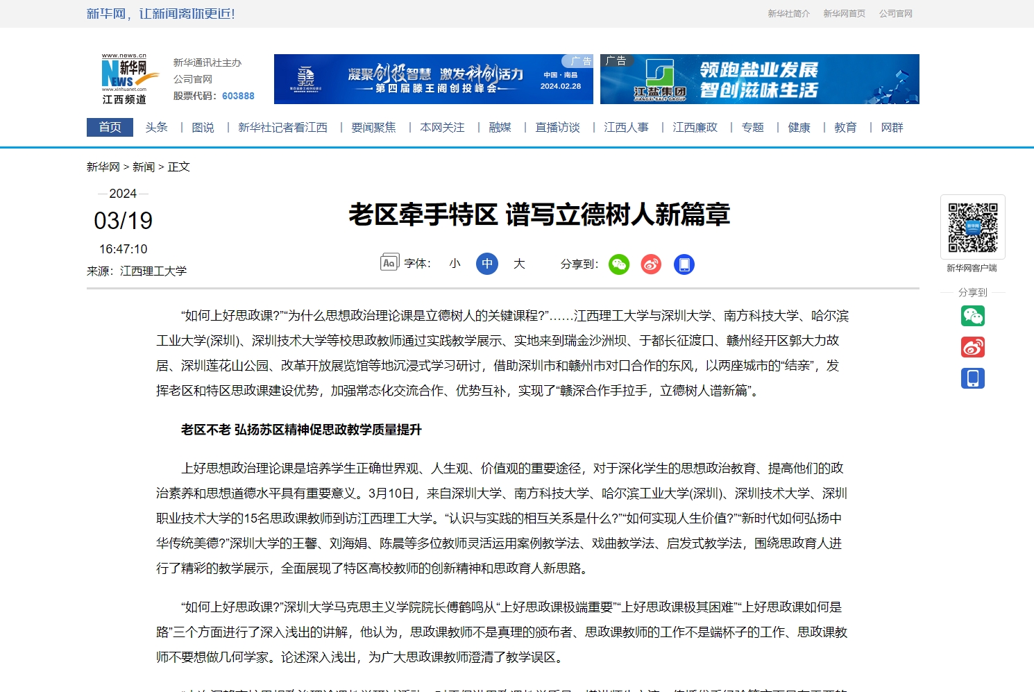 “如何上好思政课?”“为什么思想政治理论课是立德树人的关键课程?”……江西理工大学与深圳大学、南方科技大学、哈尔滨工业大学(深圳)、深圳技术大学等校思政教师通过实践教学展示、实地来到瑞金沙洲坝、于都长征渡口、赣州经开区郭大力故居、深圳莲花山公园、改革开放展览馆等地沉浸式学习研讨,借助深圳市和赣州市对口合作的东风,以两座城市的“结亲”,发挥老区和特区思政课建设优势,加强常态化交流合作、优势互补,实现了“赣深合作手拉手,立德树人谱新篇”。