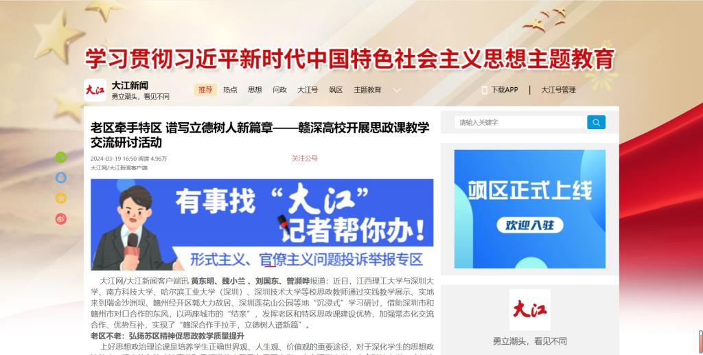 大江网/大江新闻客户端讯黄东明、魏小兰 、刘国东、曾濒哗报道:近日,江西理工大学与深圳大学、南方科技大学、哈尔滨工业大学(深圳)、深圳技术大学等校思政教师通过实践教学展示、实地来到瑞金沙洲坝、赣州经开区郭大力故居、深圳莲花山公园等地“沉浸式”学习研讨,借助深圳市和赣州市对口合作的东风,以两座城市的“结亲”,发挥老区和特区思政课建设优势,加强常态化交流合作、优势互补,实现了“赣深合作手拉手,立德树人谱新篇”。