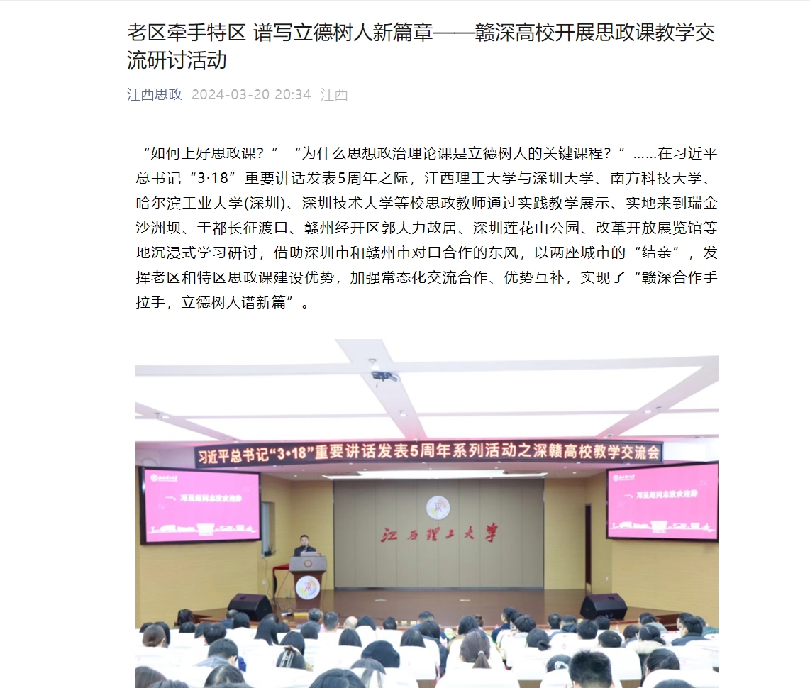 “如何上好思政课?”“为什么思想政治理论课是立德树人的关键课程?”……在习近平总书记“3·18”重要讲话发表5周年之际,江西理工大学与深圳大学、南方科技大学、哈尔滨工业大学(深圳)、深圳技术大学等校思政教师通过实践教学展示、实地来到瑞金沙洲坝、于都长征渡口、赣州经开区郭大力故居、深圳莲花山公园、改革开放展览馆等地沉浸式学习研讨,借助深圳市和赣州市对口合作的东风,以两座城市的“结亲”,发挥老区和特区思政课建设优势,加强常态化交流合作、优势互补,实现了“赣深合作手拉手,立德树人谱新篇”。