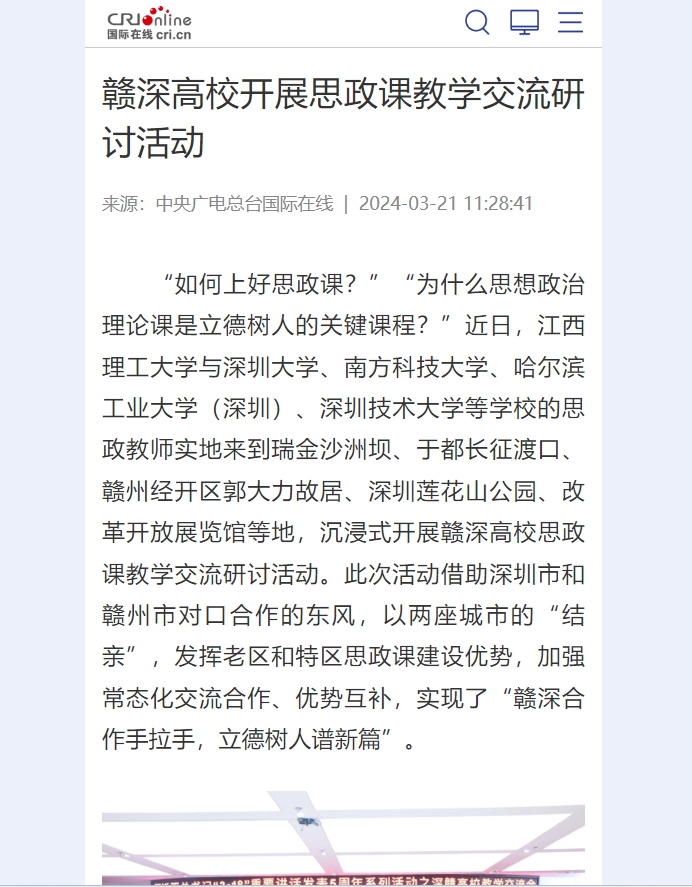 “如何上好思政课?”“为什么思想政治理论课是立德树人的关键课程?”近日,江西理工大学与深圳大学、南方科技大学、哈尔滨工业大学(深圳)、深圳技术大学等学校的思政教师实地来到瑞金沙洲坝、于都长征渡口、赣州经开区郭大力故居、深圳莲花山公园、改革开放展览馆等地,沉浸式开展赣深高校思政课教学交流研讨活动。此次活动借助深圳市和赣州市对口合作的东风,以两座城市的“结亲”,发挥老区和特区思政课建设优势,加强常态化交流合作、优势互补,实现了“赣深合作手拉手,立德树人谱新篇”。