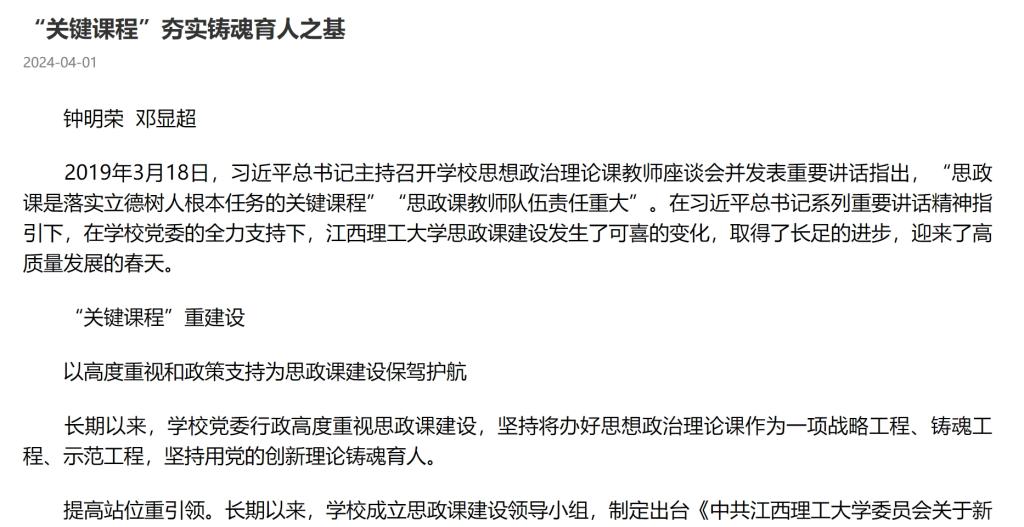 2019年3月18日,习近平总书记主持召开学校思想政治理论课教师座谈会并发表重要讲话指出,“思政课是落实立德树人根本任务的关键课程”“思政课教师队伍责任重大”。在习近平总书记系列重要讲话精神指引下,在学校党委的全力支持下,江西理工大学思政课建设发生了可喜的变化,取得了长足的进步,迎来了高质量发展的春天。
