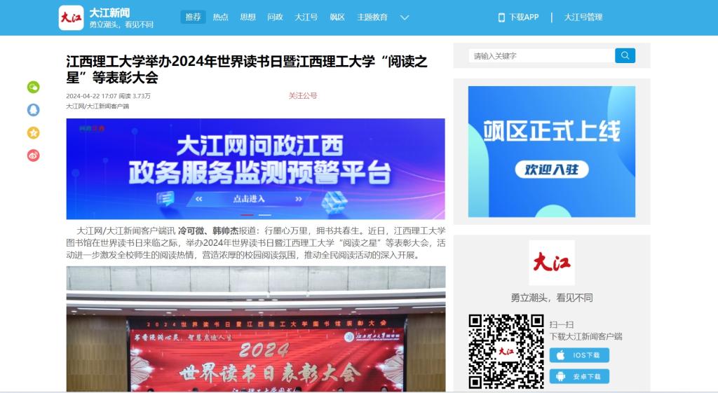 大江网/大江新闻客户端讯冷可微、韩帅杰报道:行墨心万里,拥书共春生。近日,江西理工大学图书馆在世界读书日来临之际,举办2024年世界读书日暨江西理工大学“阅读之星”等表彰大会,活动进一步激发全校师生的阅读热情,营造浓厚的校园阅读氛围,推动全民阅读活动的深入开展。