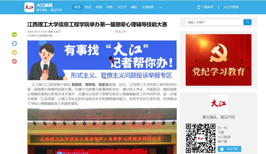 大江网/大江新闻客户端讯黄丽婷、周林琪、熊紫云报道:近日,江西理工大学信息工程学院举办第一届朋辈心理辅导技能大赛。比赛分为初赛与复赛两轮举办,通过线上考试、书面笔试、模拟朋辈心理辅导案例分析等多环节展开,比赛充分发挥了朋辈互助在心理健康教育工作中的作用,进一步提升朋辈“以点带面”心理工作队伍的专业知识水平和朋辈辅导能力,发挥学生的主体作用,有效推动了学校心理健康教育工作提质增效。