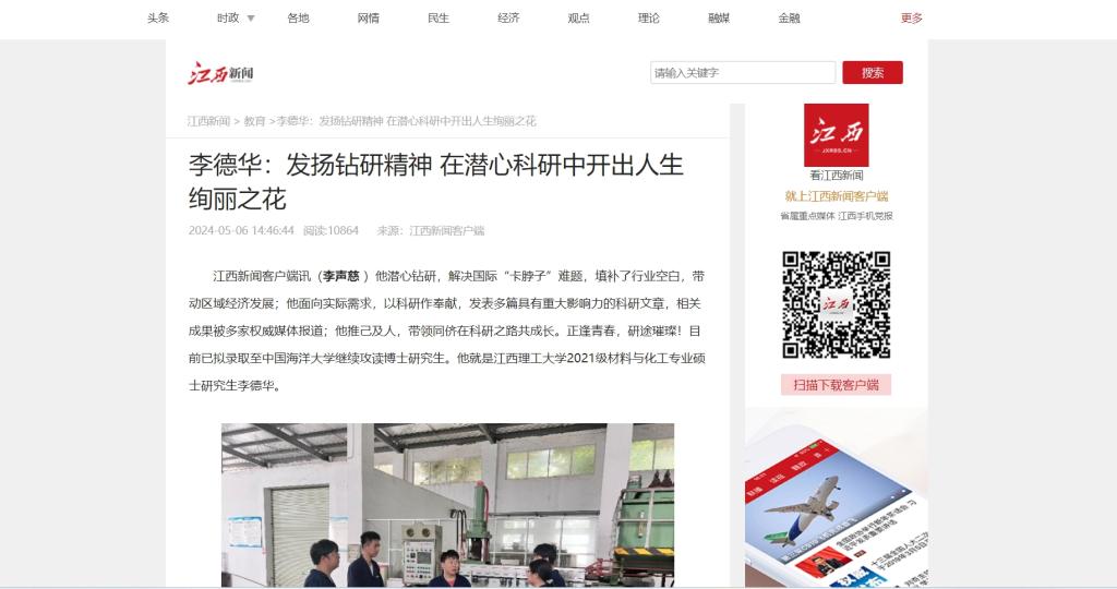 江西新闻客户端讯(李声慈)他潜心钻研,解决国际“卡脖子”难题,填补了行业空白,带动区域经济发展;他面向实际需求,以科研作奉献,发表多篇具有重大影响力的科研文章,相关成果被多家权威媒体报道;他推己及人,带领同侪在科研之路共成长。正逢青春,研途璀璨!目前已拟录取至中国海洋大学继续攻读博士研究生。他就是江西理工大学2021级材料与化工专业硕士研究生李德华。