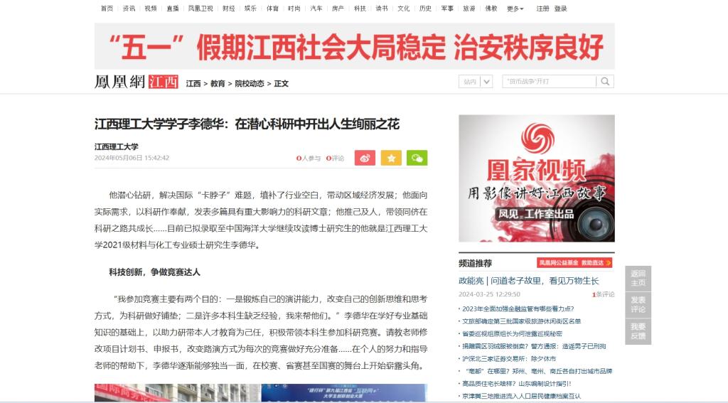 他潜心钻研,解决国际“卡脖子”难题,填补了行业空白,带动区域经济发展;他面向实际需求,以科研作奉献,发表多篇具有重大影响力的科研文章;他推己及人,带领同侪在科研之路共成长……目前已拟录取至中国海洋大学继续攻读博士研究生的他就是江西理工大学2021级材料与化工专业硕士研究生李德华。