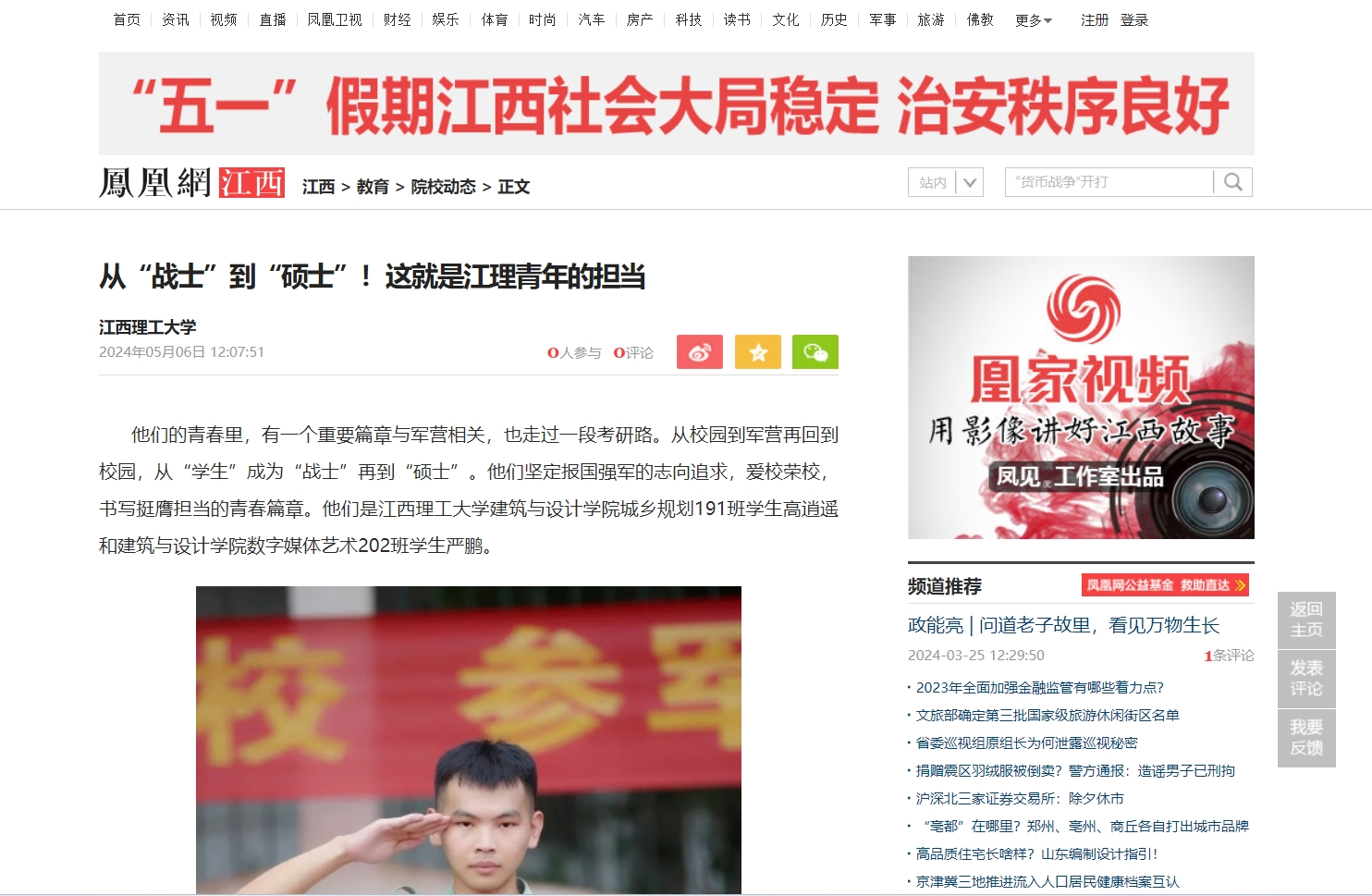 他们的青春里,有一个重要篇章与军营相关,也走过一段考研路。从校园到军营再回到校园,从“学生”成为“战士”再到“硕士”。他们坚定报国强军的志向追求,爱校荣校,书写挺膺担当的青春篇章。他们是江西理工大学建筑与设计学院城乡规划191班学生高逍遥和建筑与设计学院数字媒体艺术202班学生严鹏。