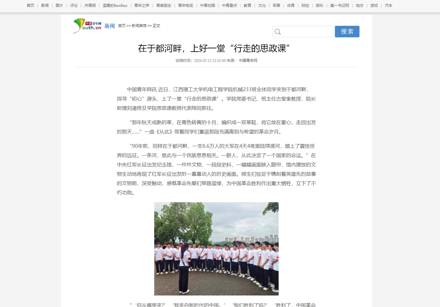 中国青年网讯 近日,江西理工大学机电工程学院机械233班全体同学来到于都河畔,探寻“初心”源头,上了一堂“行走的思政课”。学院党委书记、班主任古莹奎教授,院长助理刘道修及学院思政课教师代表陪同前往。