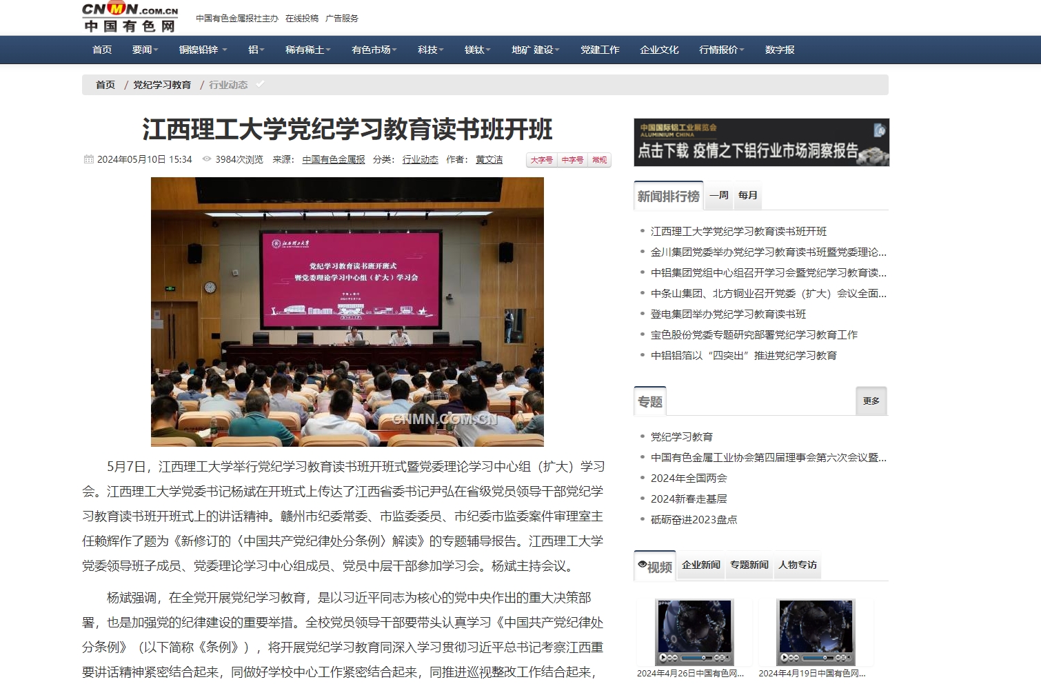 5月7日,江西理工大学举行党纪学习教育读书班开班式暨党委理论学习中心组(扩大)学习会。江西理工大学党委书记杨斌在开班式上传达了江西省委书记尹弘在省级党员领导干部党纪学习教育读书班开班式上的讲话精神。赣州市纪委常委、市监委委员、市纪委市监委案件审理室主任赖辉作了题为《新修订的〈中国共产党纪律处分条例〉解读》的专题辅导报告。江西理工大学党委领导班子成员、党委理论学习中心组成员、党员中层干部参加学习会。杨斌主持会议。