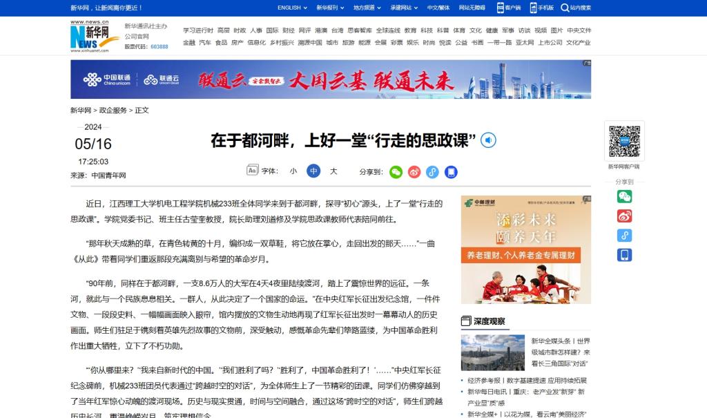 “‘你从哪里来?’‘我来自新时代的中国。’‘我们胜利了吗?’‘胜利了,中国革命胜利了!’……”中央红军长征纪念碑前,机械233班团员代表通过“跨越时空的对话”,为全体师生上了一节精彩的团课。同学们仿佛穿越到了当年红军惊心动魄的渡河现场。历史与现实贯通,时间与空间融合,通过这场“跨时空的对话”,师生们跨越历史长河,重温峥嵘岁月,筑牢理想信念。