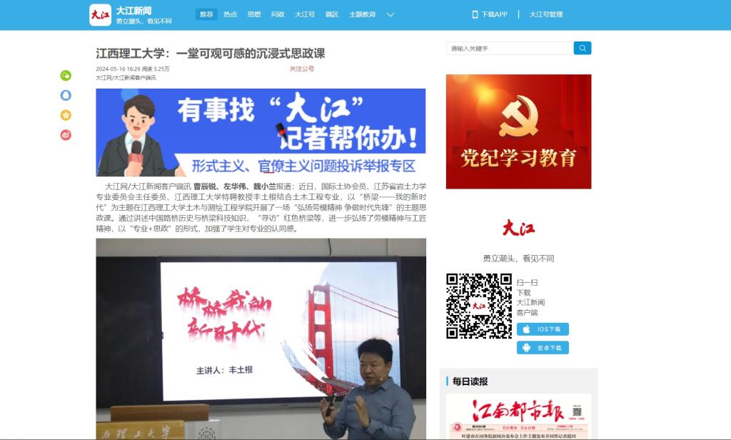大江网/大江新闻客户端讯曹辰锐、左华伟、魏小兰报道:近日,国际土协会员、江苏省岩土力学专业委员会主任委员、江西理工大学特聘教授丰土根结合土木工程专业,以“桥梁——我的新时代”为主题在江西理工大学土木与测绘工程学院开展了一场“弘扬劳模精神 争做时代先锋”的主题思政课。通过讲述中国路桥历史与桥梁科技知识,“寻访”红色桥梁等,进一步弘扬了劳模精神与工匠精神,以“专业+思政”的形式,加强了学生对专业的认同感。